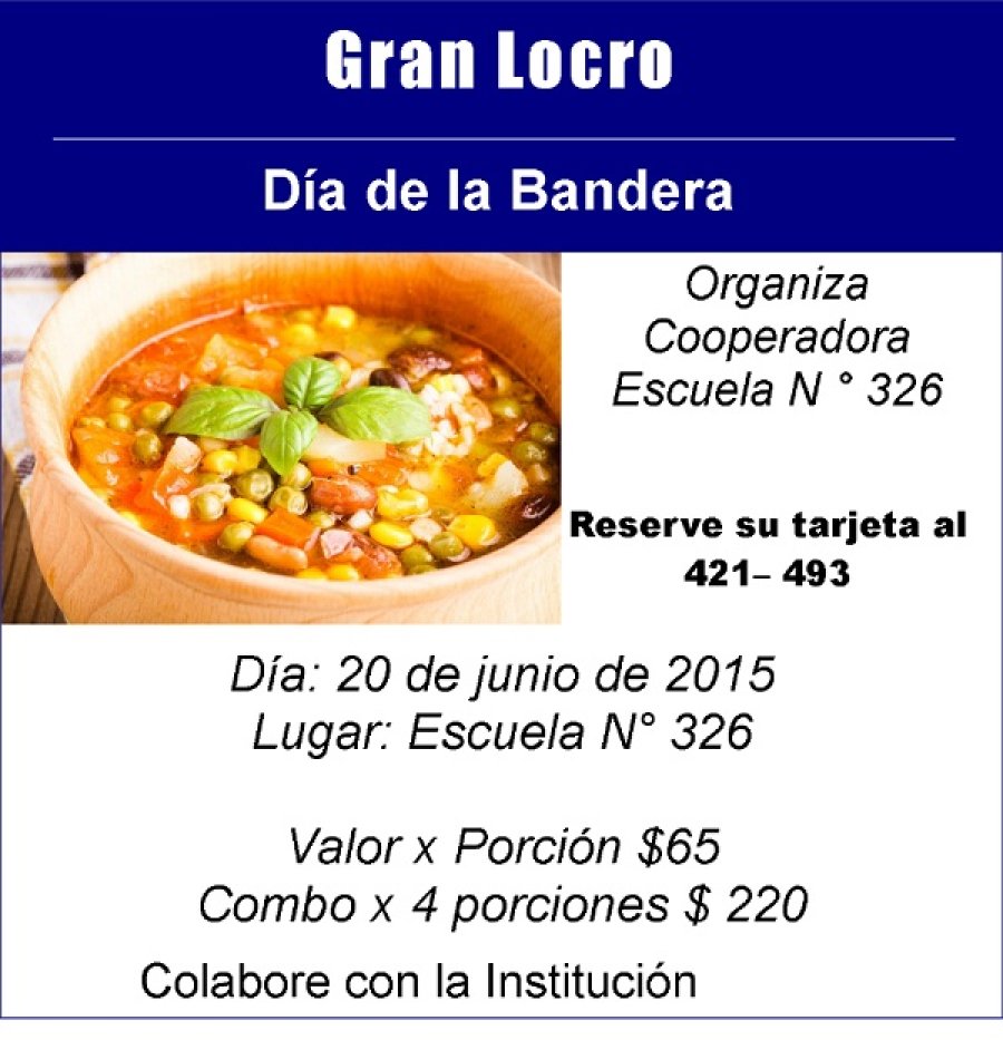 Enviar Imprimir Día: 20 de junio de 2015 Porción: $ 65,00 Combo: (4 porciones) $ 220,00 Retirar a partir de las 12:00 horas hasta las 13:30 horas. Se encuentran en venta las tarjetas para su adquisición en Escuela Nº 326 de Zapala.